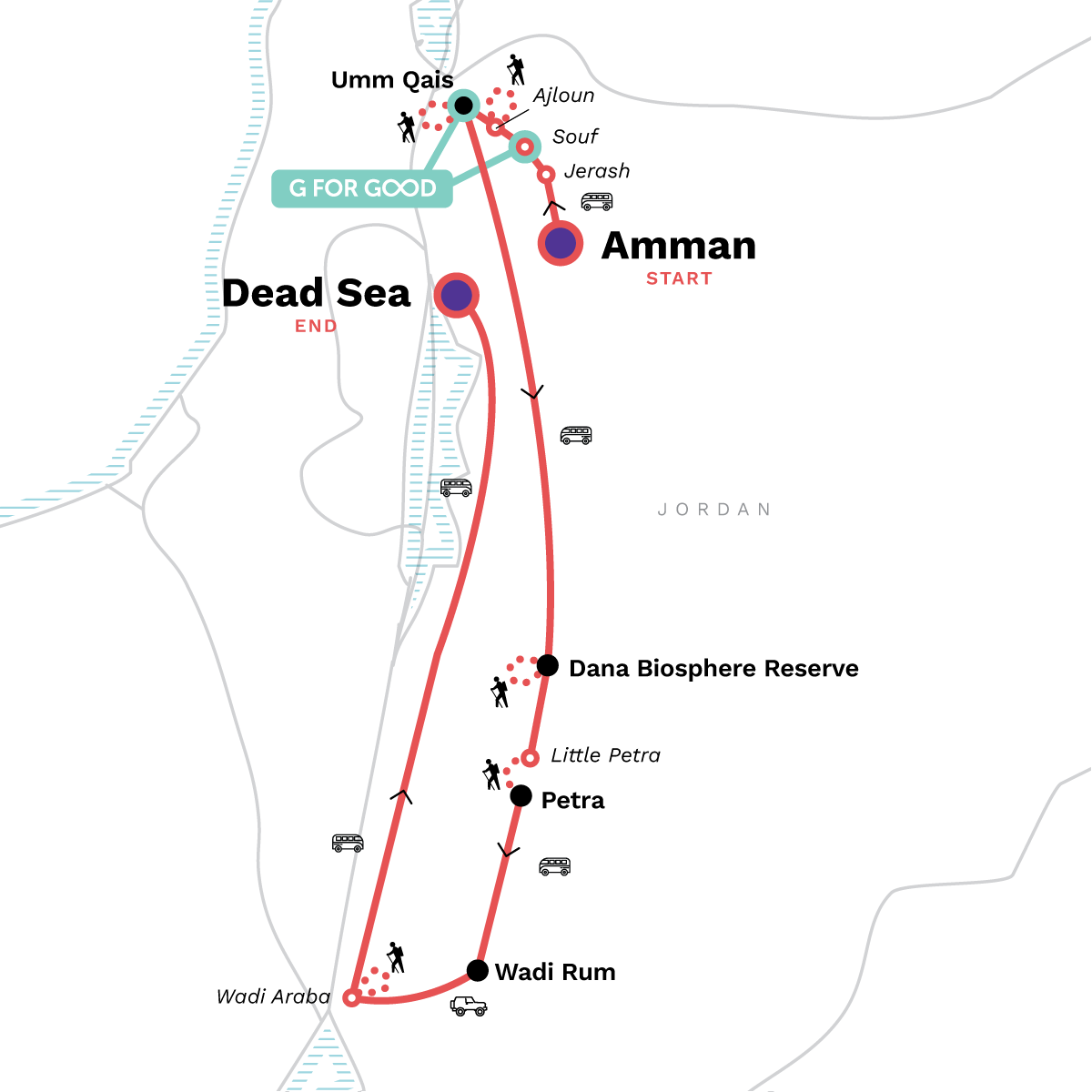 Your Local Living Moment: Bedouin Camp Overnight, Wadi Rum. Amman Market Walk. Citadel Guided Visit. Traditional Coffee Making Experience. Jerash Guided Visit. Aljoun Castle Visit and Hike. Umm Qais Village Guesthouse Stay. Umm Qais Archaeological Site Visit. Arab Dam Hike. Dana Village Hike. Little Petra Visit and back door hike to Petra. Guided Visit of Petra. Wadi Rum 4x4 excursion. Trekking in the Dana Nature Reserve. Night Walk in Wadi Rum. Bedouin Overnight Camping. Wadi Araba Hike. Dead Sea Visit. Entrance fees in all included tours. All transport between destinations and to/from included activities.