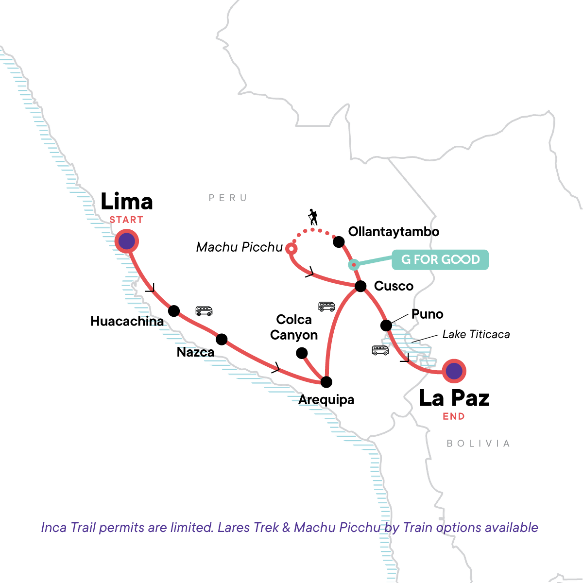 Your Big Night Out Moment: Cusco. Sunset sandboarding & dune buggies (Huacachina). Pachamanca-style lunch (Nazca). Colca Canyon excursion. Guided tour of Machu Picchu. Inca Trail hike with a local guide, cook, and porters (4 days). G Adventures-supported handmade biodegradable soap products for use on the Inca Trail. Guided Lake Titicaca excursion. All transport between destinations and to/from included activities.