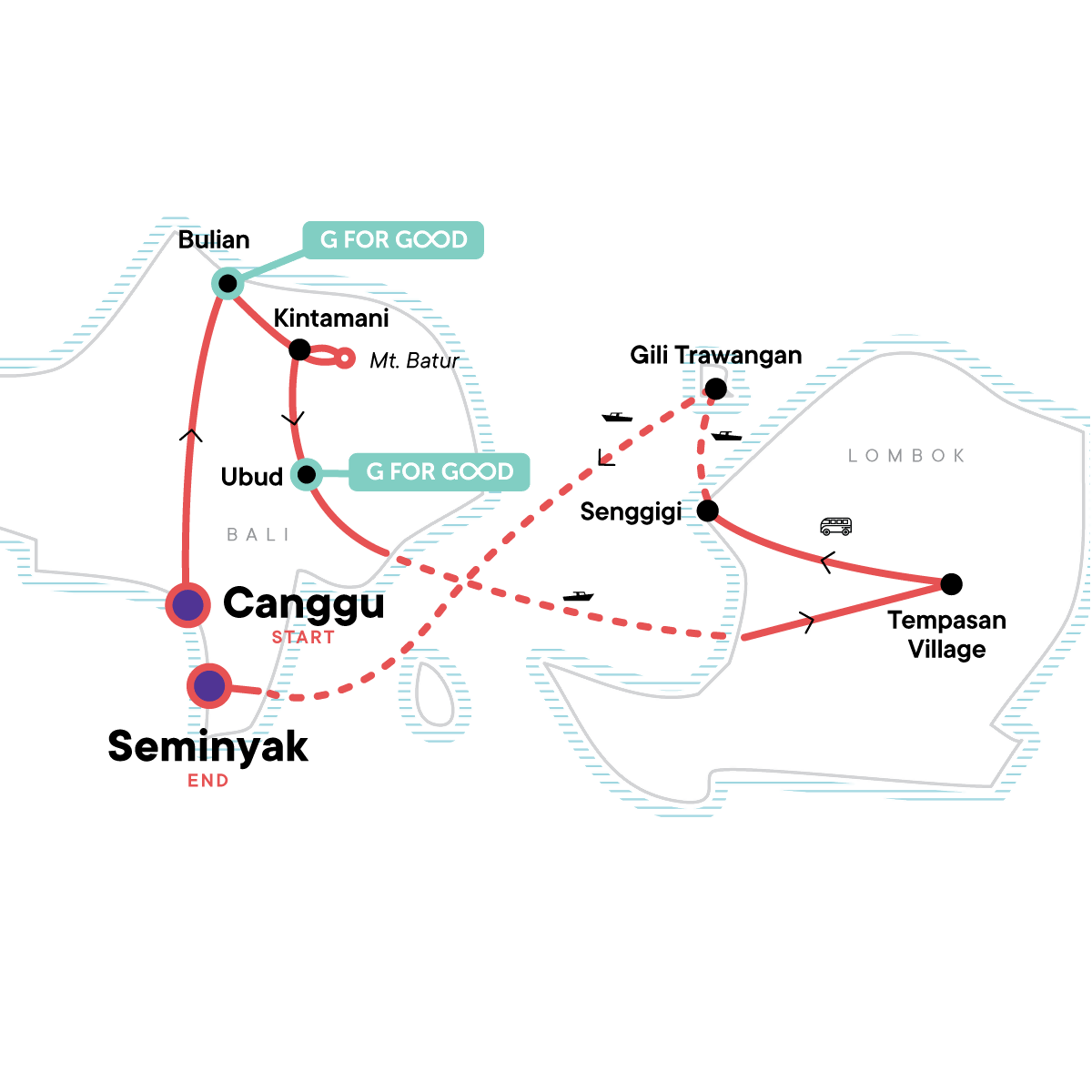 Your Big Night Out Moment: in Gili Trawangan, Gili Trawangan. 2-hour surf lesson in Canggu. Free time in Canggu. Ulun Danu Temple. Bulian Village Tour with local guide. Camping in Kintamani. Mt Batur sunrise hike + hot spring soaks. Free time in Ubud. Rice terrace & village guided walk. Pringgasela weaving village visit. Traditional loom demonstration. Afternoon tea at Aranka homestay. Bonjeruk Village immersion experience. Gili Trawangan 3-Island Snorkeling Tour. Free time in Gili T. All transport between destinations and to/from included activities.