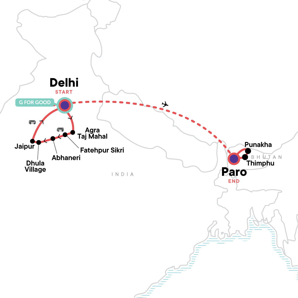 Your Welcome Moment: Meet Your CEO and Group. Sustainable Development Fees. Agra Fort visit. Taj Mahal visit. I'timad-ud-daulah (Baby Taj) entrance. Fatephur Sikri visit. Jaipur City Palace entrance and guided tours. Abhaneri stepwell visit. Memorial Chorten & Motithang Takin Preserve visit. Chimi Lakhang Hike. Explore Paro Dzong and Archery grounds. Free time in Thimphu, Punakha, and Paro. Hike to Taktsang Monastery Tiger's Nest. All transport between destinations and to/from included activities.