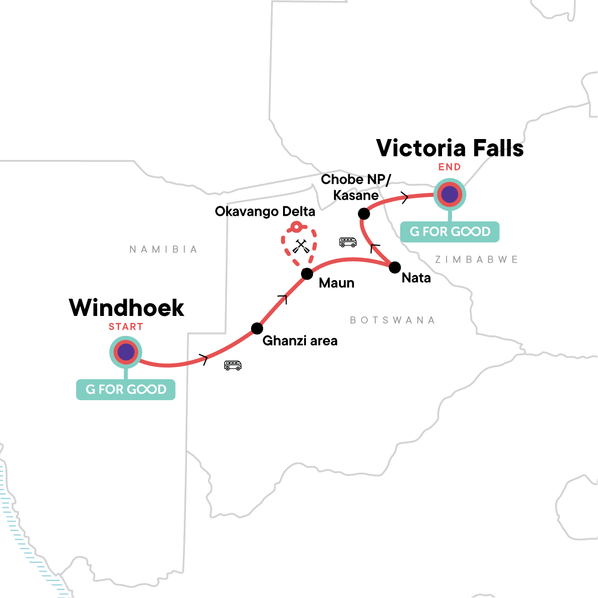 This Classic trip showcases some of the best that Africa has to offer. Journey from Namibia, across Botswana and on to Zimbabwe on an authentic African adventure that includes the elephants of Chobe National Park. Meet San Bushmen in the blazing Kalahari and explore the Okavango Delta by mokoro canoe. This adventure includes a night camping in the Delta for a bedtime you'll never forget.