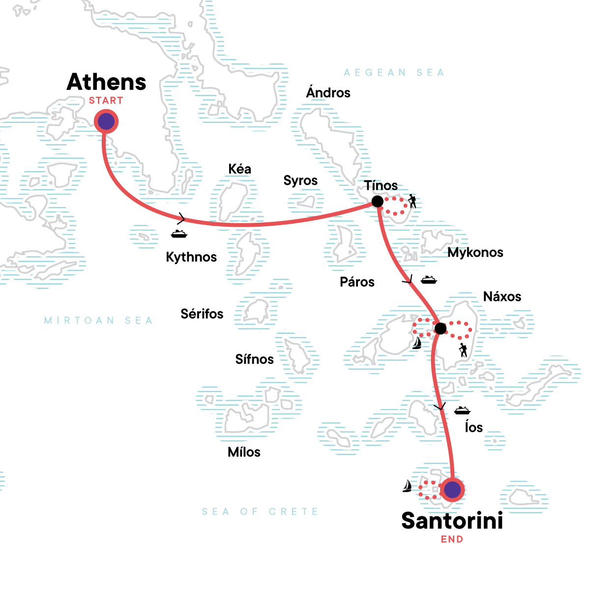Enjoy a walking tour of Athens with visits to ancient Agora and the Acropolis, Hike up Filopappou Hill and toast the setting sun overlooking the structures of Ancient Greece, Experience the tastes and flavours of Greece on a food tour in Tinos, Hike to the castle of Tinos with local guide ending with a climb of Exombourgo Mountain, Discover the history of Naxos on a full immersion food tour featuring Byzantine churches and a Citron distillery and liqueur tasting, Sail & snorkel in the heart of the Aegean Sea visiting caves near Antiparos, Walk from Fira to Oia for a unique experience in Santorini featuring the most sought-after views of the islands.