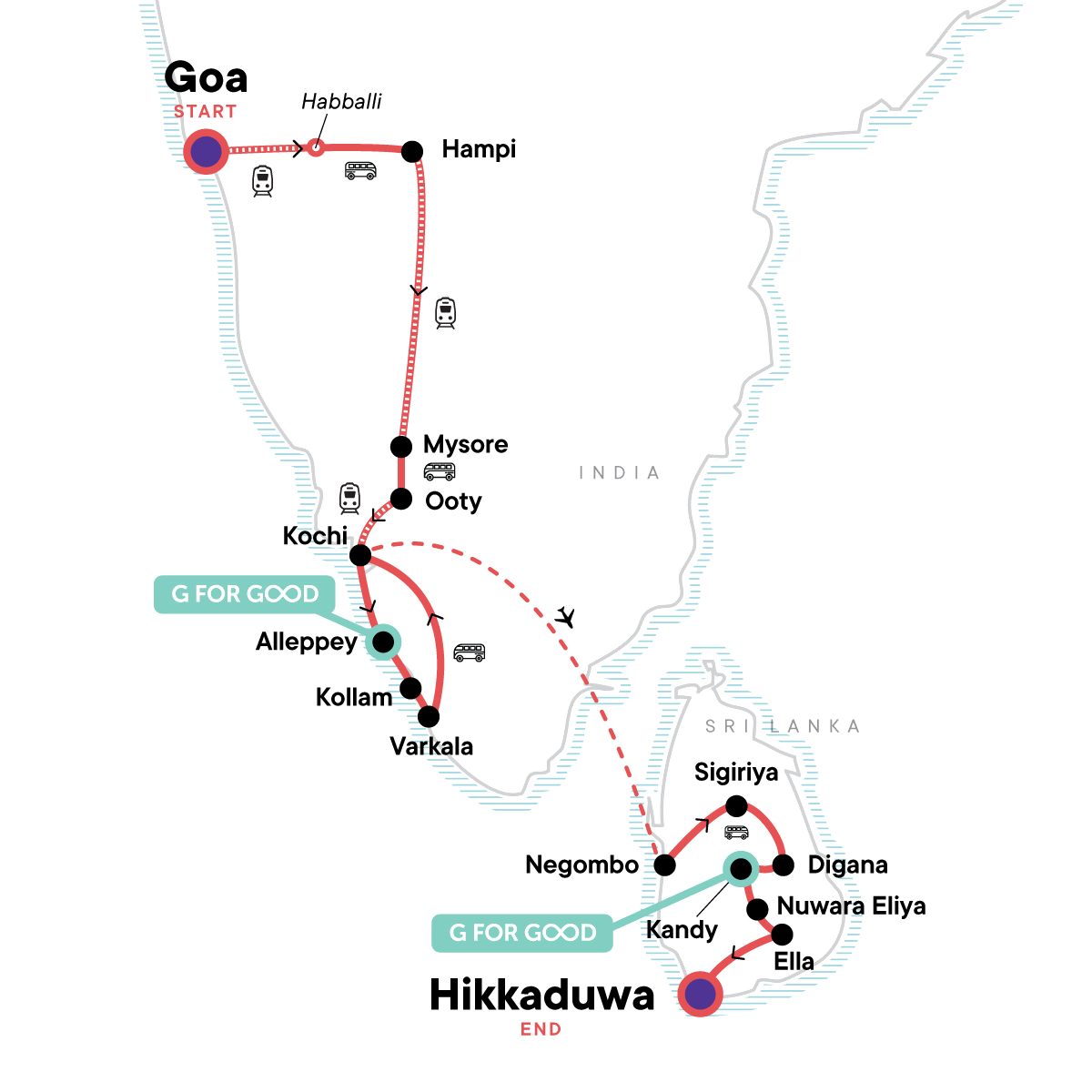 Your Big Night Out Moment: Hikkaduwa Beach Bar, Hikkaduwa. Free time in Hampi & Ooty. Hampi Ruins Wlaking Tour. Anjaneya Temple Sunset. Devaraja Market Visit. Chamundi Hills Visit. Monolithic Bull Visit. Dodapetta Peak. Dodapetta Tea Factory. Fort Kochi Visit. Orientation walks in Alleppey, Kollam, and Fort Kochi. Morning ferry cruise on Alleppey's backwaters. Sri Lankan lunch at a local village. Spice garden visit. Tea plantation tour. Little Adam's Peak Tour. Galle Fort tour. All transport between destinations and to/from included activities.