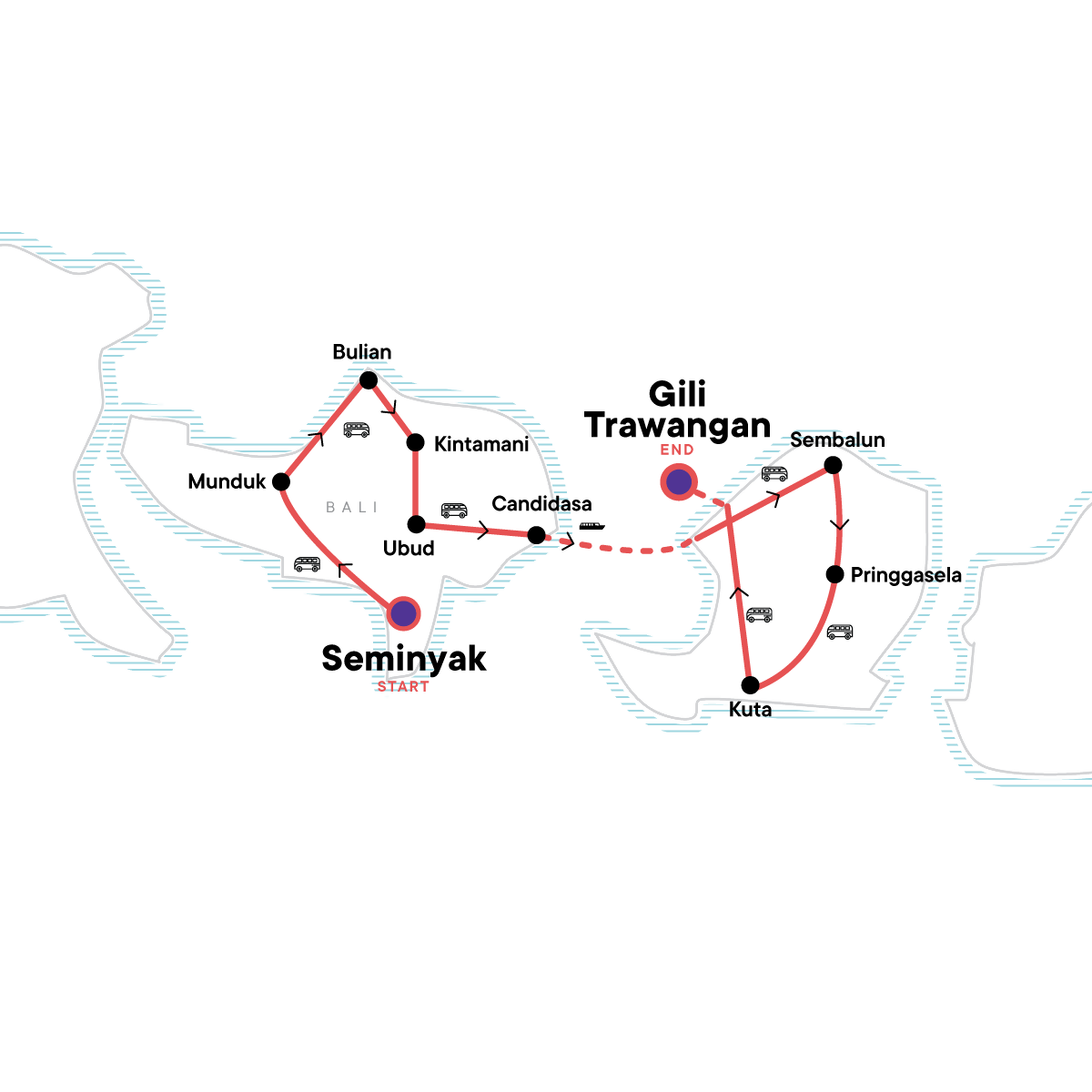 Your Discover Moment: Ubud. Jatiluwih Rice Terraces Visit. Ulun Danu Temple Complex Visit. Banjar Hot Springs. Singaraja Traditional Market. Beji Temple. Bulian Village Tour. Lemukih Village Trek. Free time in Mt Batur. Penglipuran Village Visit. Pura Gunung Kawi Sebatu Temple. Free time in Ubud. Women led walking excursion at the foothills of Mt Rinjani. Local cooking experience near Pringgasela. Pringgasela village walking tour. Visit a traditional Sasak village. Free time in Kuta. Bonjeruk village visit with cycling and local lunch. Free time to relax on the beaches of the Gili Islands. Free time in Candidasa. Transport to/from included activities.