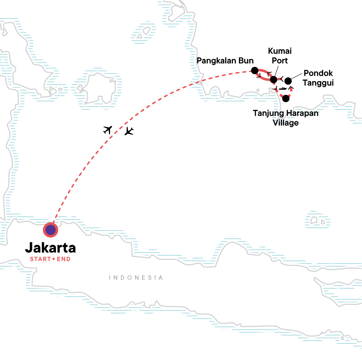 Your Welcome Moment: Meet Your CEO and Group. 3 night live-aboard Klotok Boat Experience. Tanjung Harapan Orangutan Rehabilitation Center. Tanjung Harapan Night Trek. Tanjung Harapan Village Experiences & Feeding Treks. Two Camp Leakey Primate Center Experiences. Pondok Tanggui Trek. Free time in Pangkalan Bun & Jakarta. Transport to/from included activities. Internal airfare.