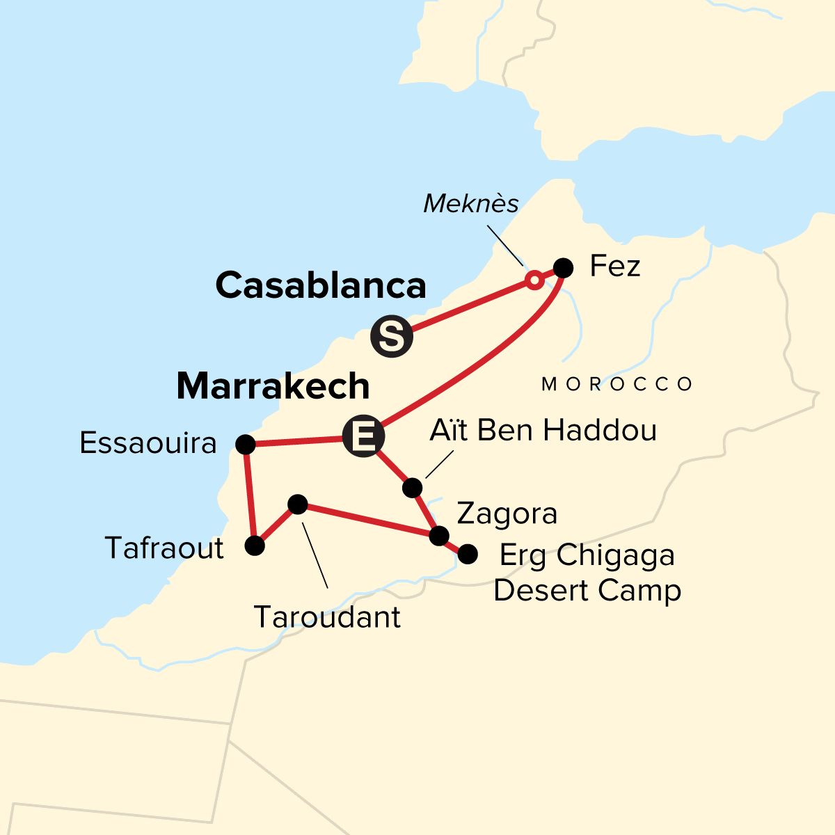 Arrive at any time. Arrival transfer is included. Please note that this tour does not spend any time in Casablanca.