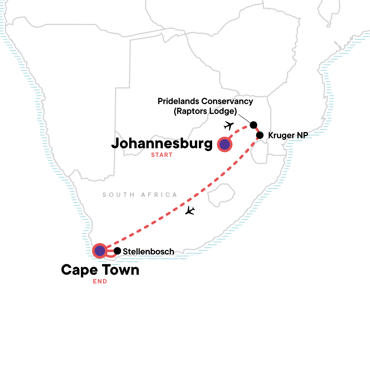 South Africa is a country that thrills at every turn — and this journey blends the wild, the refined, and the unforgettable. Begin in Kruger National Park, tracking lions and elephants on foot alongside expert guides who know the bush like no one else. Then trade safari for sophistication in Stellenbosch, pedalling E-bikes through sun-drenched vineyards and sampling world-class wines straight from the source. Cap it all off with a coastal finale: sipping cocktails atop Table Mountain and winding your way along the dramatic Cape Peninsula. Adventure and indulgence, nature and culture — this is South Africa at its most spectacular.