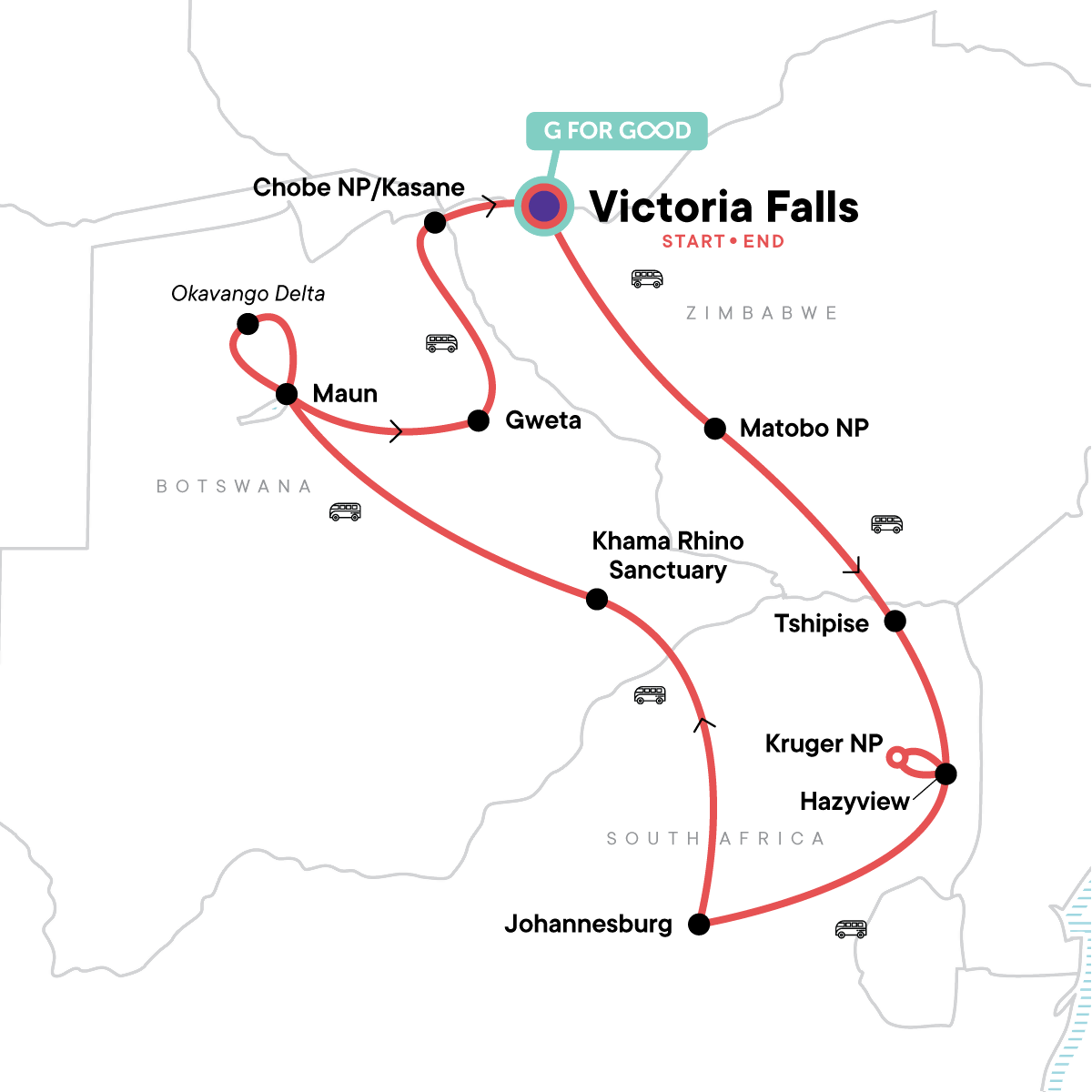Your First Night Out Moment: Connect With New Friends. Guided rhino walk and open vehicle safari drive in Matobo NP. Kruger NP entrance with wildlife safari drives in our overland vehicle. Traditional dinner and local dancing. Khama Rhino Sanctuary Drive. Okavango Delta overnight bush camping excursion. All transport between destinations and to/from included activities.