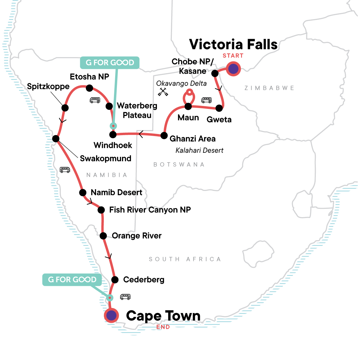 Track the Big Five, feel the mist of Victoria Falls, cruise the Chobe River at sunset, camp in African wilderness, meet the San people, get your heart pumping with adrenaline activities, soak up Cape Town's culture