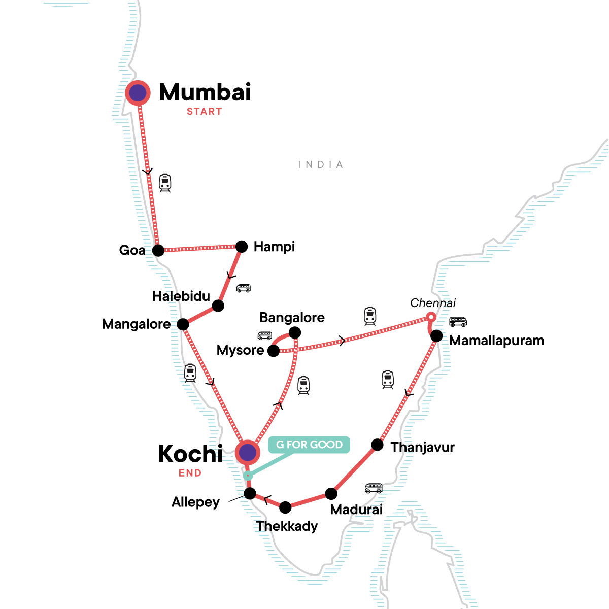 Your Local Living Moment: Kerala Backwaters Homestay, Alleppey. Colaba Sunrise Walk. Guided exploration of Elephanta Caves. Heritage walk of Fontainhas (Portuguese quarter). Visit to Old Goa churches. Sunset visit and exploration of Hampi ruins. Guided exploration of Halebidu ruins. Hoysaleshwara Temple. Scenic train journeys: Mumbai → Goa, Goa → Hampi, Mangalore → Kochi. Fort Kochi Visit. Free Time in Kochi. Lal Bagh Gardens Visit. Free Time Bangalore. Bangalore Orientation Walk. Sri Ranganatha Swamy Temple Visit. Tomb of Tipu Sultan. Devraja Market Visit and Orientation Walk. Chamundi Hills Visit. Mysore Palace Visit. St. Philomena's Cathedral Visit. Mysore Free time. Free time in Mamallapuram. Sunrise Shore Temple Visit. Brihadeeswara Temple. Bronze Casting Workshops. Chettinad Traditional House Visit. Thirumalai Nayak Palace Visit. Meenakshi Temple Visit. Cycle-Rickshaw Tour. Cardamom Hills Spice Plantation Tour. Free Time in Thekkady. Boat through Kerala Backwaters. Kerala Backwaters Homestay. Lunch at Theruvarom Women Empowerment Project. Orientation Walk in Kochi. Kathakali Dance.