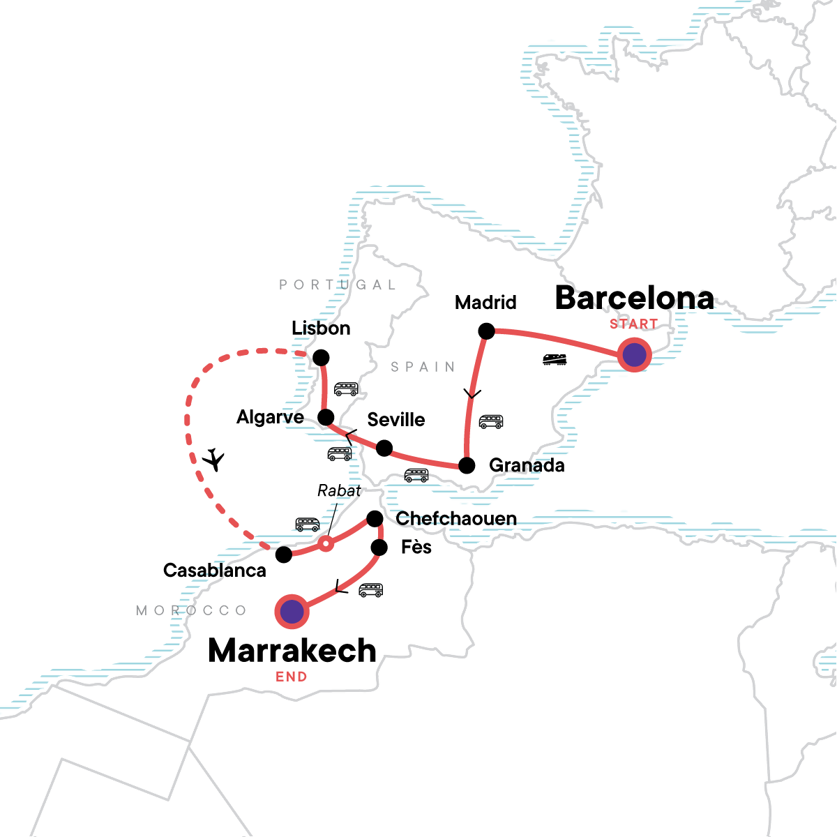 Your Big Night Out Moment: Lisbon. Tapas bar crawl (Granada). Orientation walks in Barcelona, Madrid, Granada, Seville and Lisbon. Enjoy free time in Rabat. Explore the blue city of Chefchaouen. Visit the medina and souks of Fès. Discover the bustling city of Marrakech. All transport between destinations and to/from included activities.