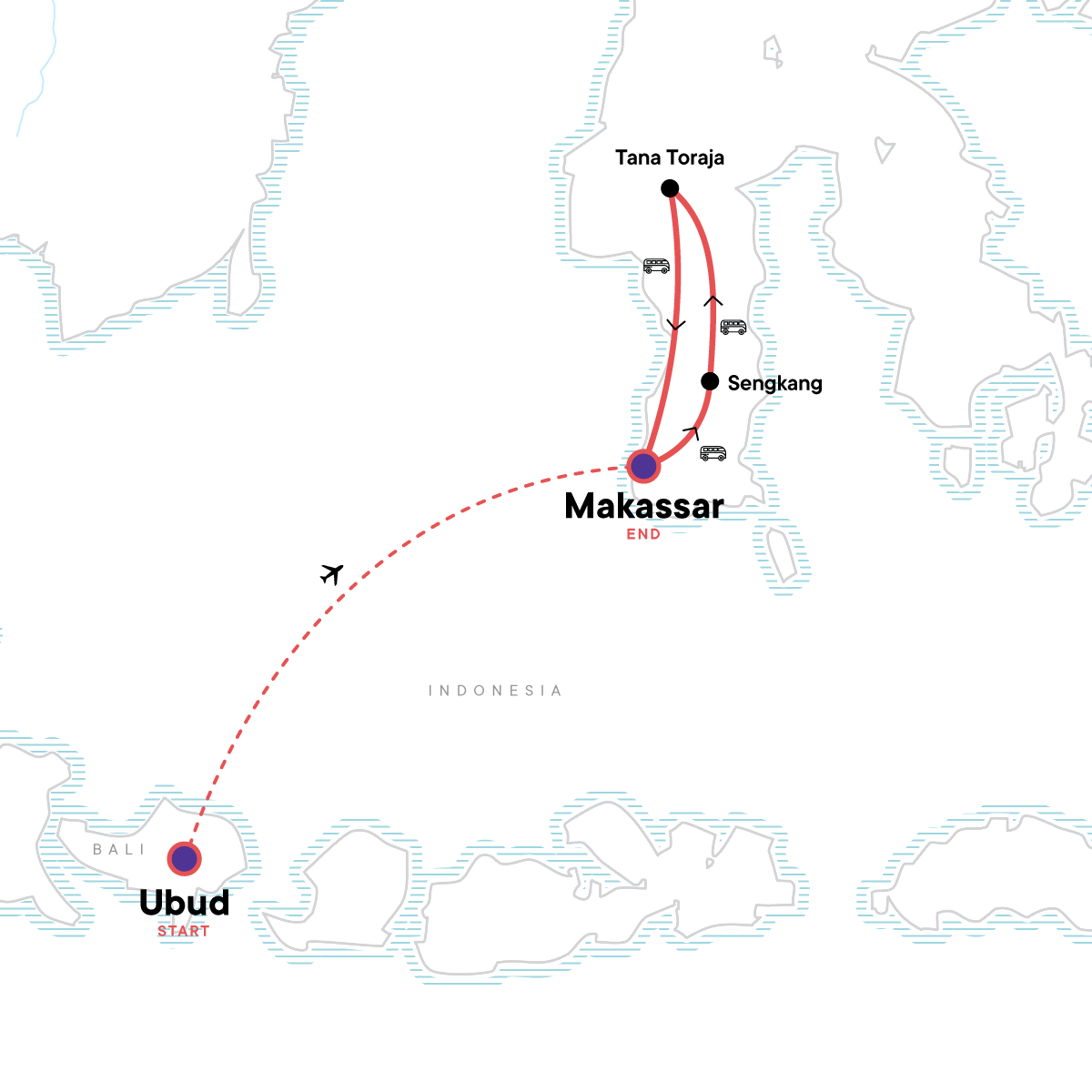 Your Foodie Moment: Local Torajan Lunch, Londa. Maros Village Adventure. Lake Tempe Boat Tour. Puncak Lakawan Visit. Suaya Baby Tree & Royal Graves. Lemo Village & Burial Site Exploration. Traditional Cave Burial Site of Londa. Local Torajan Lunch. Ke’te Kesu’ Traditional Torajan Village. Fort Rotterdam Visit. Masjid 99 Kubah Mosque visit. Free time in Ubud. Free time in Makassar & Tana Toraja. Transport to/from included activities. Internal airfare.