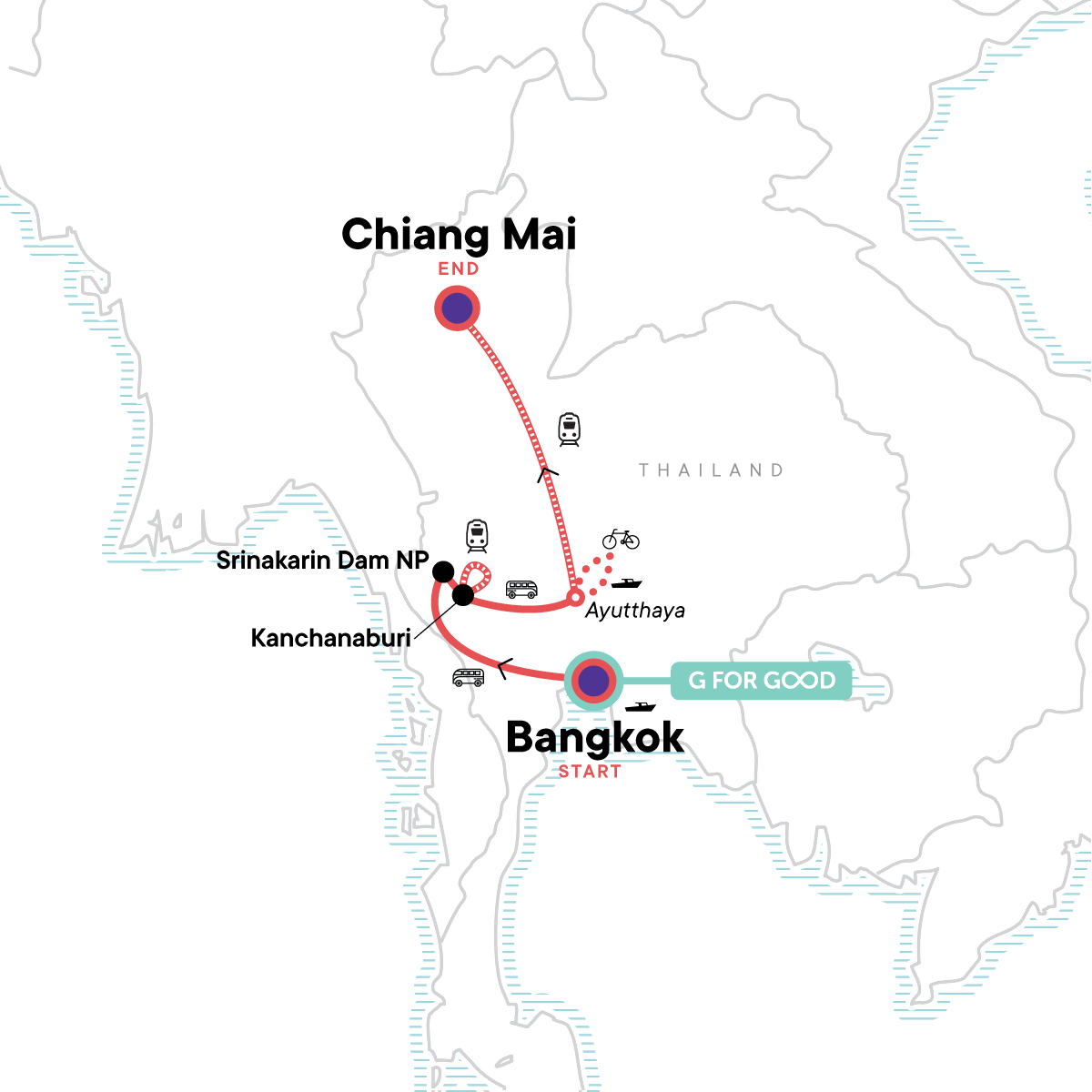 Your Foodie Moment: Street Food Dinner in Chinatown, Bangkok. Bangkok Klong Riverboat Tour. Visit Hellfire Pass and Ride the Death Railway. Visit Bridge on the River Kwai and Thai/Burma Railway Centre and Allied War Cemetery. Visit a Local Rice Farm. Ayutthaya Cycling. Boat Tour. Chiang Mai Old Town Orientation Walk. Chiang Mai Night Market Walk. Sunrise Alms Giving. Doi Suthep Temple Visit. All transport between destinations and to/from included activities.