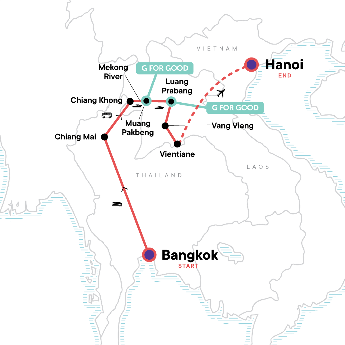 Your Discover Moment: Luang Prabang. Bangkok klong trip. Wat Pho entrance and guide. Doi Suthep entrance (Chiang Mai). Mekong River slow boat excursion. Pak Ou caves entrance (Luang Prabang). Traditional Arts & Ethnology Museum guided tour. Ock Pop Tok Living Crafts Centre. Meal with local Baan Ou Community. Kuang Si waterfalls trek (half-day). Water puppets performance (Hanoi). Ho Chi Minh Mausoleum entrance (when open). Internal flight. All transport between destinations and to/from included activities.