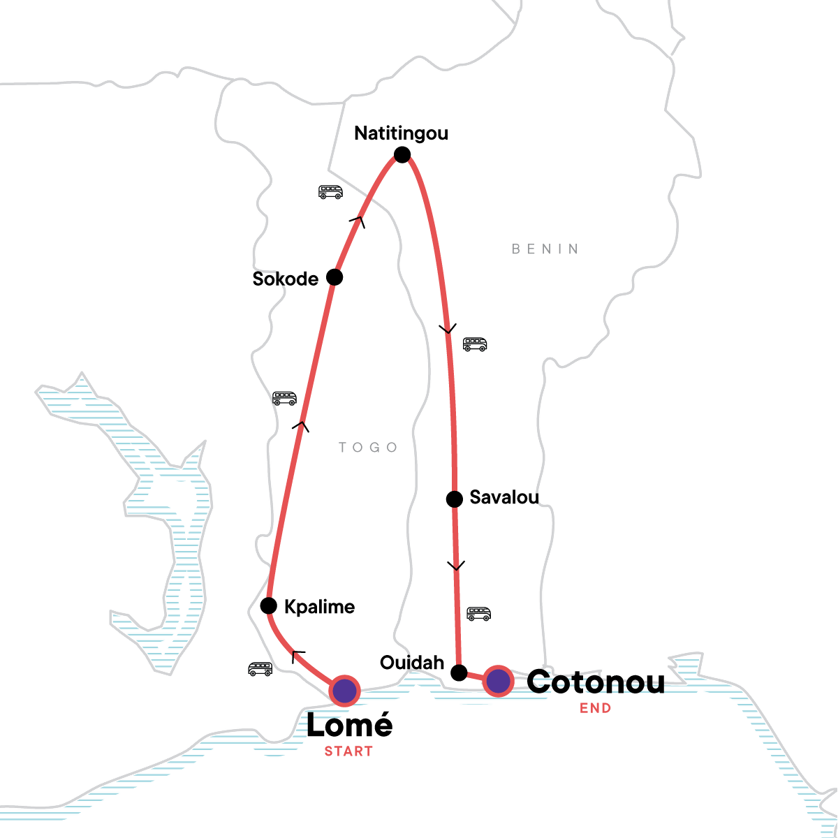 Your Hands-On Moment: Atitovou Community Visit & Kente Cloth Weaving, Atitovou. Arrival transfer. Grand Marche and German Cathedral Visit. Atitovou Community Visit & Kente Cloth Weaving. Mount Kloto Visit & Hike. Atakpame Markets. Sokodé Horse Dance. Sokodé's Traditional Fire Dance. Traditional Fugu Weavers of Bafilo. Iron Smelting at Tsare Community. Koutammakou UNESCO World Heritage Site Visit. Fulani Village Visit. Tata Somba Village Visit & Walk. Organic Shea Butter Process with a Local Family. Visit the Regional Museum in Natitingou. Teneka Beri Mountain Community Visit. Dankoli Shrine Visit. The Gelede Masked Dance. Visit the Underground Dwellings. Chameleon Temple Visit & Private Palace Walkthrough. Kokou Ceremony & Lake Nokoue Visit. Amazone Statue in Cotonou. Walking tour of Grand Marché du Dantokpa. All transport between destinations and to/from included activities.