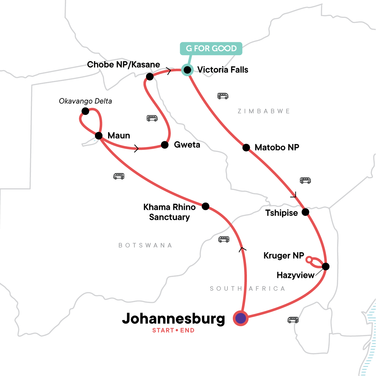 Your Discover Moment: Victoria Falls. Khama Rhino Sanctuary Drive. Okavango Delta overnight bush camping excursion. Guided walk and open vehicle safari drive in Matobo NP. Kruger NP entrance with wildlife safari drives in the Lando. Traditional dinner and local dancing. All transport between destinations and to/from included activities.